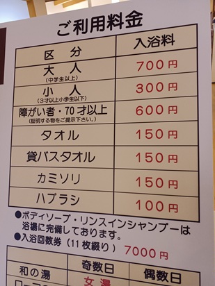 | Price 950yen.Rental towel 300 yen. People with tattoos are not allowed to bathe |