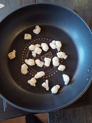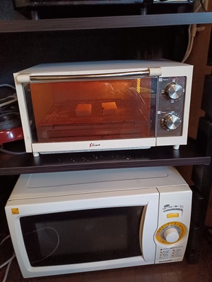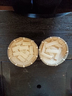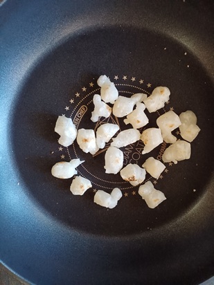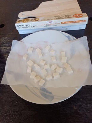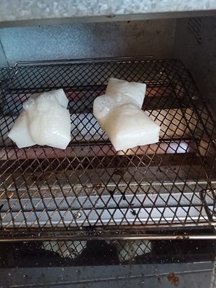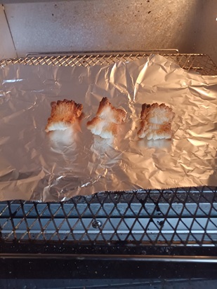 | Cut the mochi into small pieces | Arrange with gaps | |||