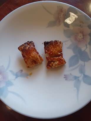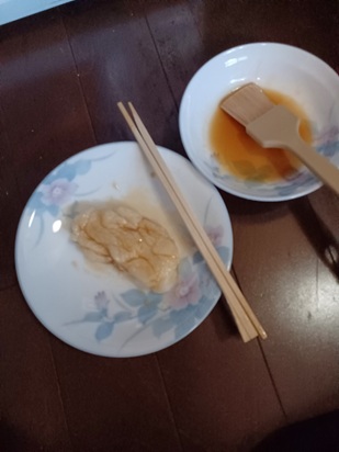 | Heat until it retains its shape. | Mix soy sauce, mirin, sugar, etc. | The shape has been distorted. | Brush with soy sauce and grill. |