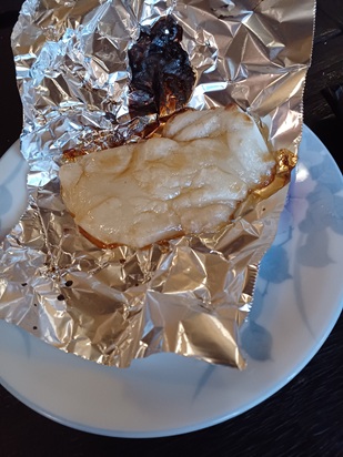 | Cut into small pieces and dry. | It's best to turn it inside out. | It's fine to leave it as is, but I like to brush it with soy sauce. |