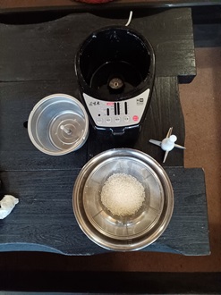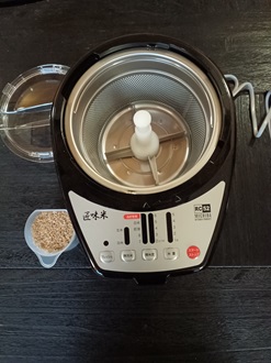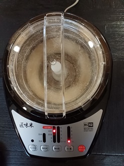 Put the brown rice intothe rice polisher. |